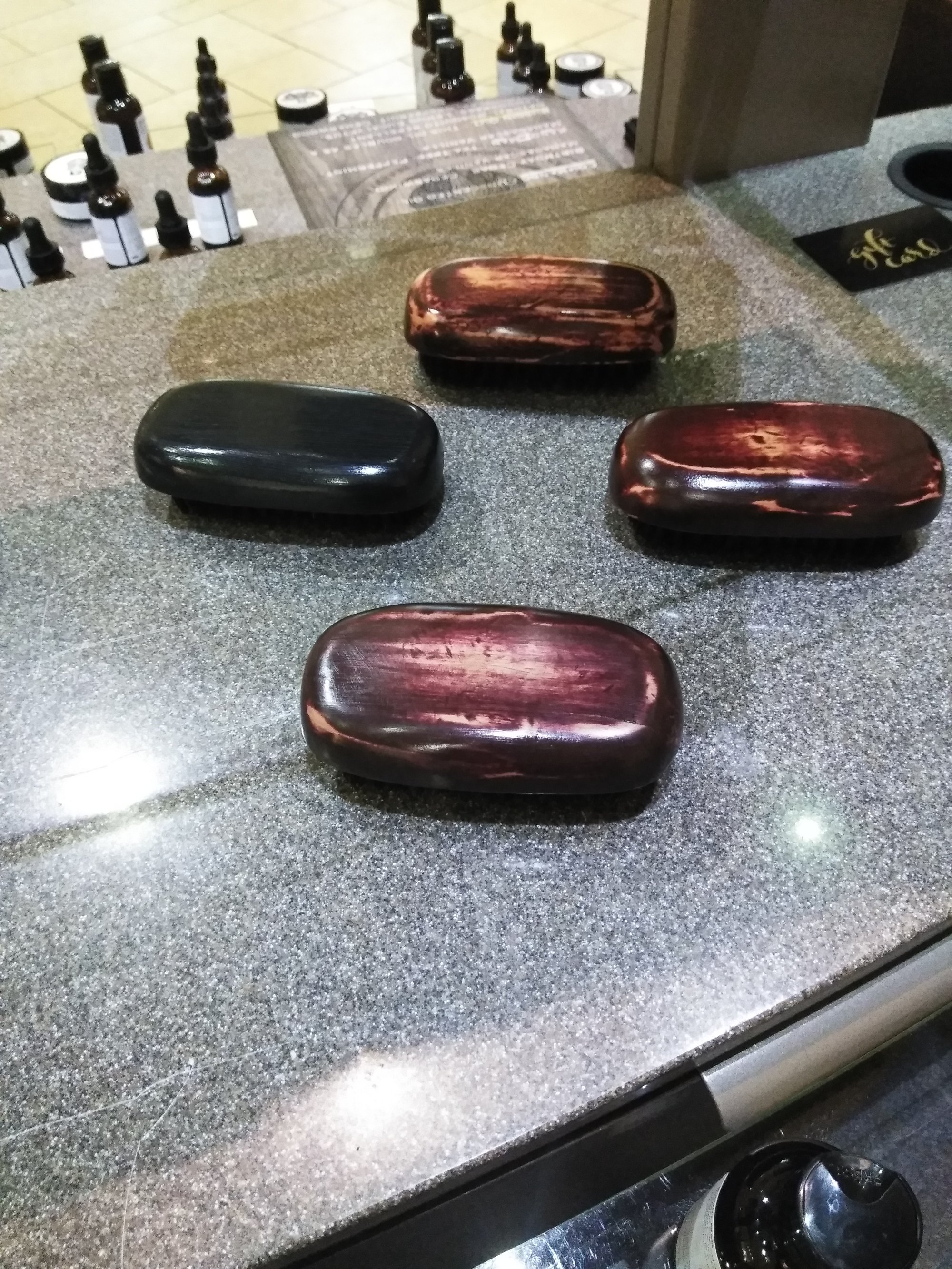 Natural boars hair brush. Helps smooth out and distribute the oil throughout your beard. Hand sanded, stained and sealed making every brush unique.